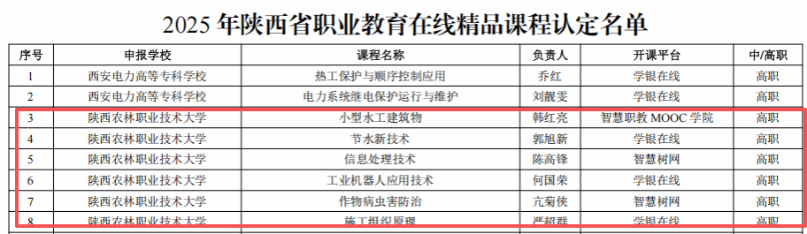 11月28日,省教育厅公布了2025年陕西省职业教育在线精品课程认定名单。我校教师韩红亮负责的《小型水工建筑物》、郭旭新负责的《节水新技术》、陈高锋负责的《信息处理技术》、何国荣负责的《工业机器人应用技术》、亢菊侠负责的《作物病虫害防治》、严超群负责的《施工组织原理》等6门课程入选。