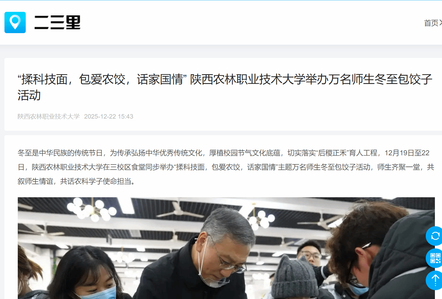 陕西农林职业技术大学万名师生冬至包饺子活动从2017年至今,已经持续开展了8年,成为了学校的一项传统特色活动。这项活动不仅为师生们提供了一个欢聚一堂、共度佳节的温馨平台,更在潜移默化中传承和弘扬了中华优秀传统文化,增强了师生们的文化自信和民族自豪感,更让“学农爱农、强农报国”的信念深深根植于学子心田。