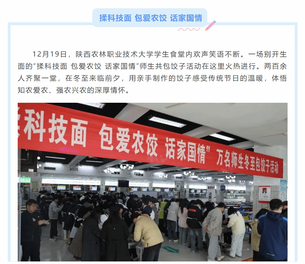 12月19日,陕西农林职业技术大学学生食堂内欢声笑语不断。一场别开生面的“揉科技面 包爱农饺 话家国情”师生共包饺子活动在这里火热进行。两百余人齐聚一堂,在冬至来临前夕,用亲手制作的饺子感受传统节日的温暖,体悟知农爱农、强农兴农的深厚情怀。