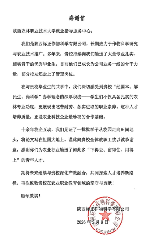 近日,中国水电建设集团十五工程局有限公司、陕西好邦食品股份有限公司、陕西泾航企业管理集团有限公司、陕西标正作物科学有限公司等多家用人单位向学校发来感谢信,对我校毕业生的专业素养、综合能力和敬业精神给予高度评价,并对学校在校企合作、人才共育及就业服务等方面的工作表示感谢。