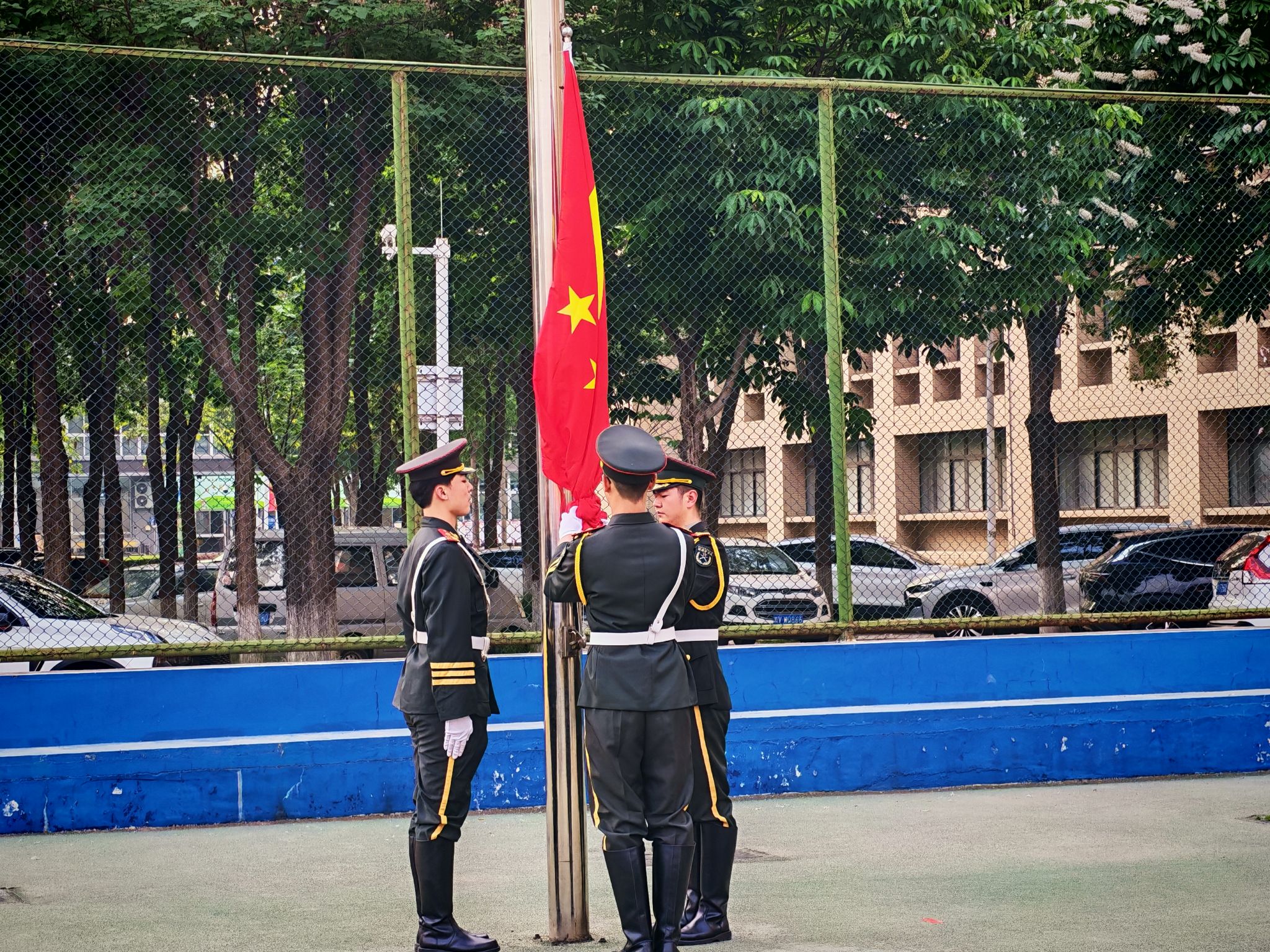 伴随着铿锵有力的口令,国旗护卫队身姿挺拔、步履铿锵,迈着整齐划一的步伐昂首阔步入场出旗。全场肃立注目,齐声高唱中华人民共和国国歌,五星红旗迎着晨光冉冉升起,迎风飘扬,嘹亮歌声回荡校园,饱含着对党和祖国的无限热爱,彰显着新时代青年昂扬向上的精神风貌。