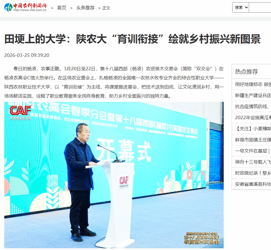 春日的杨凌,农事正酣。3月20日至22日,第十八届西部(杨凌)农资苗木交易会(简称“双交会”)在杨凌农高会C馆火热举行。在这场农业盛会上,扎根杨凌的全国唯一农林水牧专业齐全的综合性职业大学——陕西农林职业技术大学,以“育训衔接”为主线,将课堂搬进展会、把技术送到田间、让文化浸润乡村,用一场场鲜活实践,诠释了职业教育服务全民终身教育、助力乡村全面振兴的独特力量。